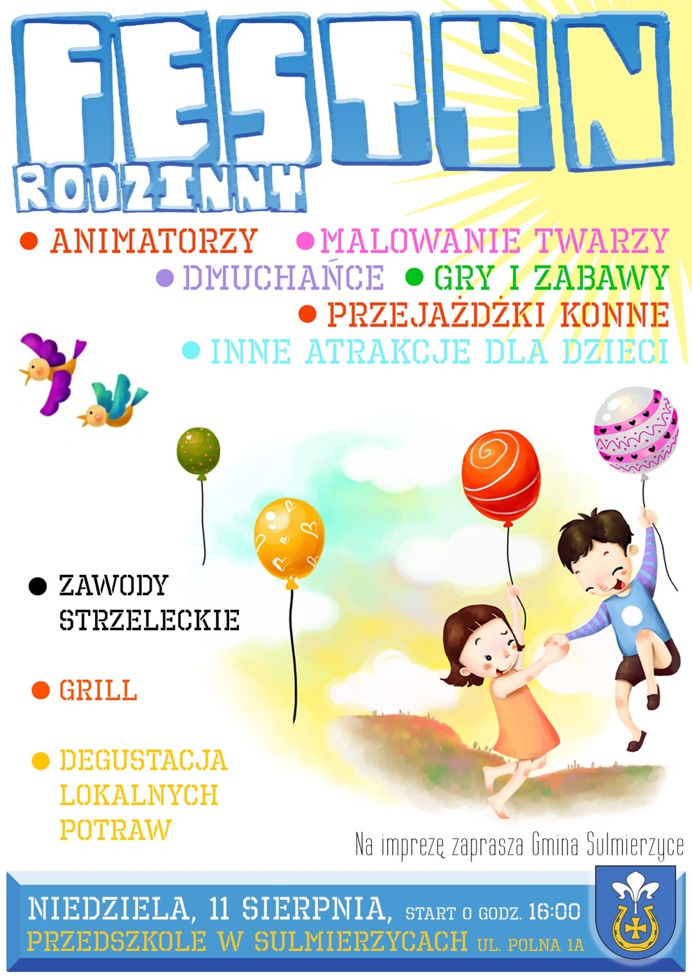 W niedzielę 11 sierpnia Gmina Sulmierzyce zaprasza dzieci i dorosłych na Festyn Rodzinny. Impreza odbędzie się na placu przy Przedszkolu w Sulmierzycach, ul. Polna 1A. Początek o godz. 16:00. W programie masa atrakcji, szczególnie dla dzieci: animatorzy, malowanie twarzy, dmuchańce, dry i zabawy, przejażdżki konne i wiele innych. Dla dorosłych zawody strzeleckie, grill, degustacja lokalnych potraw.