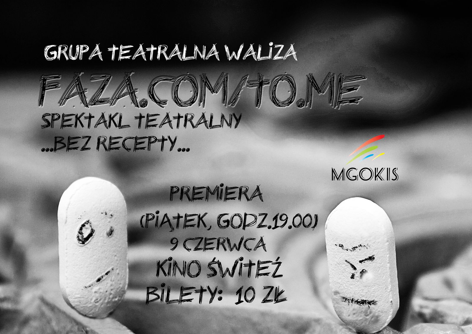 Miejsko-Gminny Ośrodek Kultury i Sportu zaprasza na przedstawienie teatralne FAZA.COM/TO.ME. Spektakl na podstawie sztuki Akosa Nemetha przygotowała grupa teatralna Waliza. Premiera odbędzie się 9 czerwca (godz.19.00), w kinie Świteź.