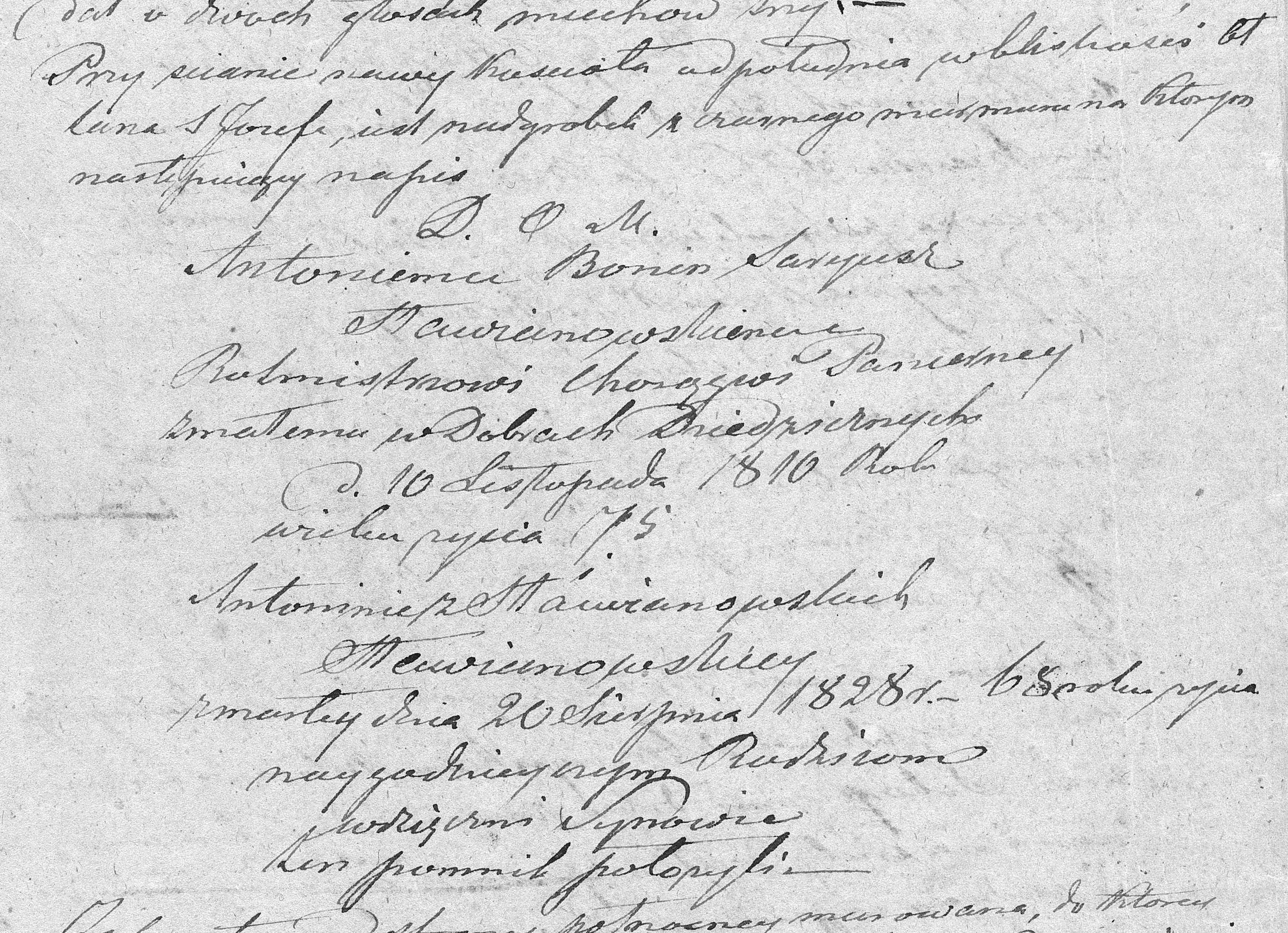 Historia Pajęczna wiąże się nierozerwalnie z historią parafii. A nasza parafia to także okoliczne miejscowości, gdzie swój żywot wiedli przeróżni ludzie. Może nie wszyscy wiedzą, ze kiedyś do parafii pajęczańskiej należały Dworszowice Pakoszowe. Właścicielami Dworszowic, Ostrołęki i innych okolicznych wiosek byli Sławianowscy herbu Jelita. Przypuszczam, że te dobra należały do nich już w XIIIV. Potem majątek ten sprzedano Bartnickim. A jaki związek mają Sławianowscy z Pajęcznem, a konkretnie z kościołem? Nieco starsi Forumowicze może pamiętają, że w naszym kościele WNMP po prawej stronie, obok ołtarza św. Józefa stał czarny nagrobek. Był to nagrobek, który swoim rodzicom Antoninie i Antoniemu Sławianowskim w dowód pamięci synowie „położyli”. Epitafium z tego nagrobka umieściłem na zdjęciu nr 1S. Treść pochodzi z archiwalnego opisu kościoła. Czy był to tylko kamień nagrobny, a pod nim był właściwy grób, tego nie wiem. Antoni Sławianowski Rotmistrz Chorągwi Pancernej zmarł w 10.11. 1810r. W jego akcie zgonu, który jest na zdjęciu 2S jest napisane „Jacet in Coemeterio versus Altare major (lub majus)”, co można przetłumaczyć „leżąc na cmentarzu w kierunku większego ołtarza”. Wtedy jeszcze funkcjonował cmentarz przykościelny. Czy ten zapis świadczy o miejscu pochówku, tzn. teren kościoła jako budynek, czy teren cmentarza przykościelnego, trudno jest mi rozstrzygnąć. Akt zgonu żony Antoniego Antoniny Sławianowskiej zmarłej 20.08.1828r. nic nie mówi o miejscu pochówku.