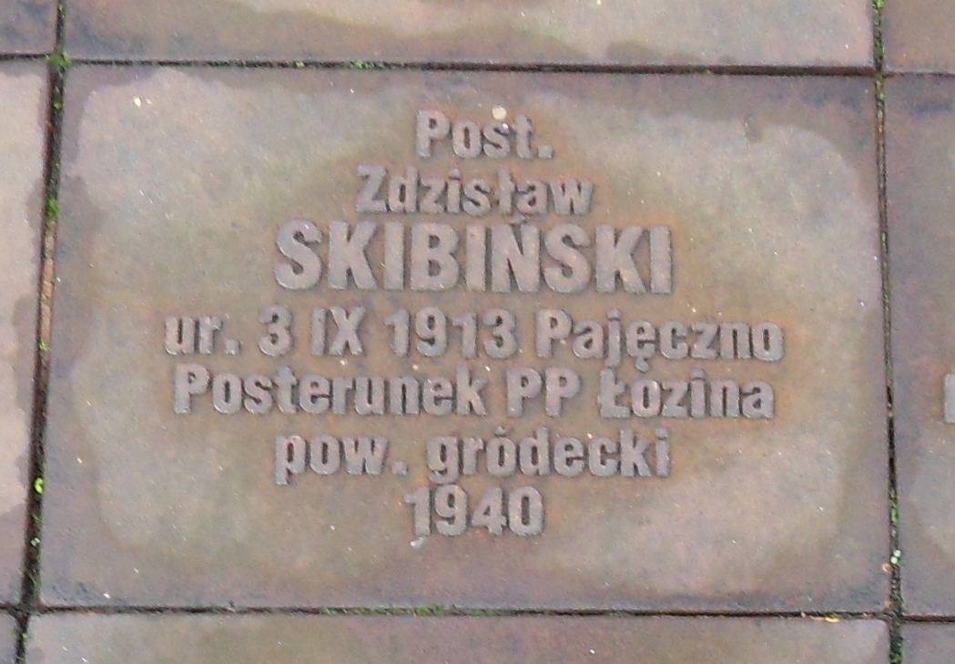 „Post. PP Zdzisław Jan SKIBIŃSKI s. Piotra i Franciszki z Wańków, ur. 14 VII 1913 w Pajęcznie. W policji od 15 IX 1936 jako kand. kontr. na szer. Po ukończeniu 30 IX 1937 NSzF w Mostach Wielkich pow. żółkiewski skierowany do woj.