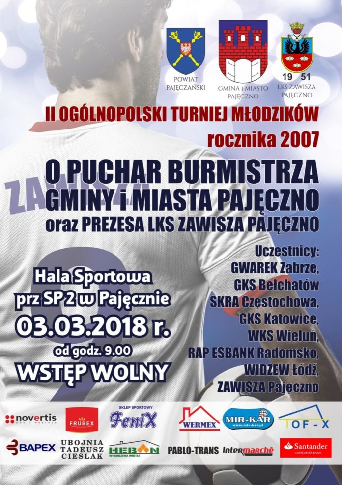 W sobotę 3 marca w Hali Sportowej przy SP2 w Pajęcznie odbędzie się „Ogólnopolski Turniej Młodzików rocznika 2007 o Puchar Burmistrza Pajęczna i Prezesa LKS Zawisza Pajęczno”.