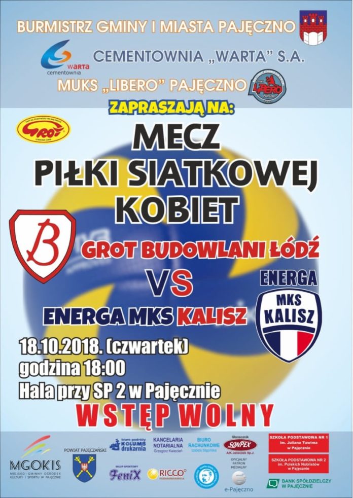 W najbliższy czwartek 18 października o godzinie 18:00 w Hali Sportowej przy Szkole Podstawowej nr 2 w Pajęcznie (ul. Grunwaldzka) odbędzie się pokazowy mecz piłki siatkowej kobiet pomiędzy drużynami GROT BUDOWLANI Łódź a ENERGA MKS Kalisz.