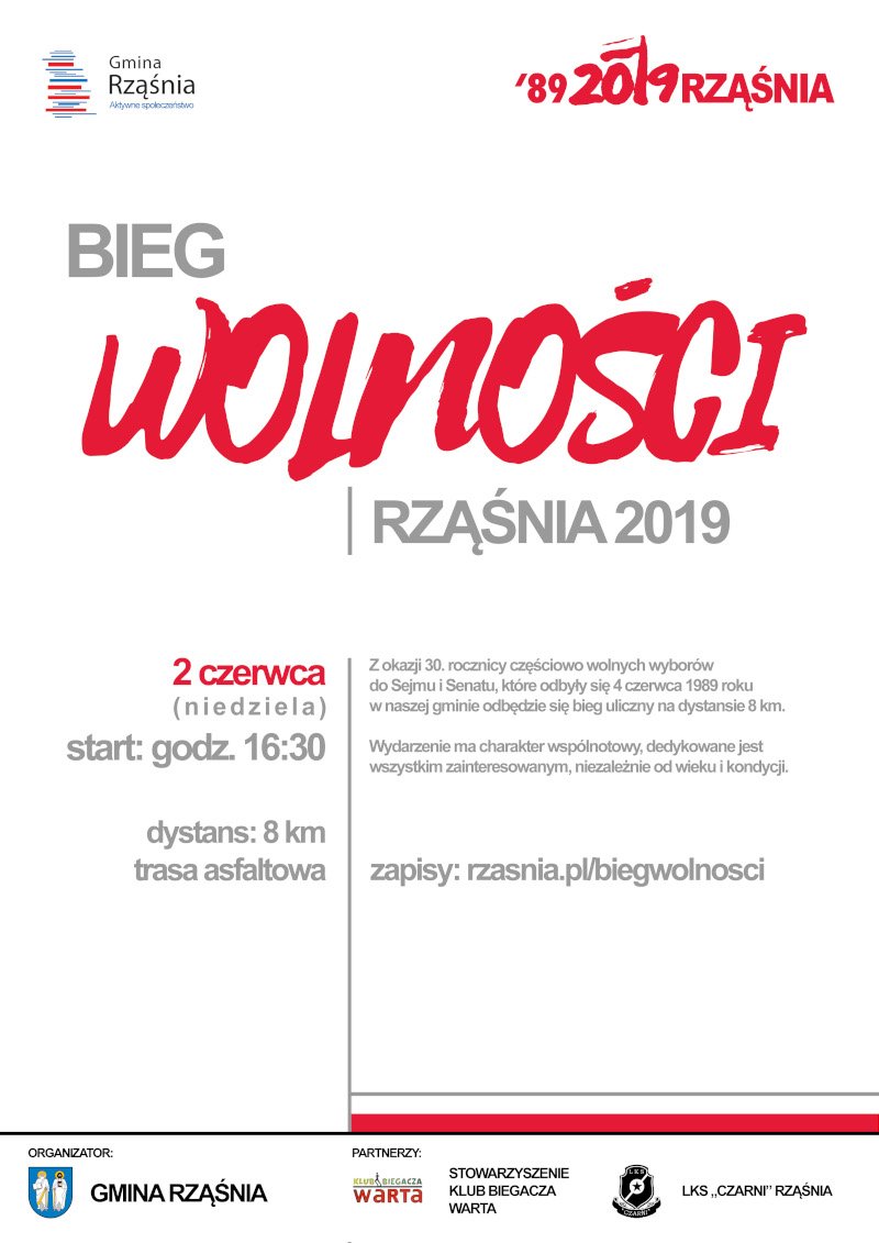 Z okazji trzydziestej rocznicy częściowo wolnych wyborów do Sejmu i Senatu, 2 czerwca o godz.16:30 w Rząśni odbędzie się bieg uliczny na dystansie 8 km pod nazwą: “I Bieg Wolności Rząśnia 2019”. Dystans biegu to 8 kilometrów po trasie asfaltowej.