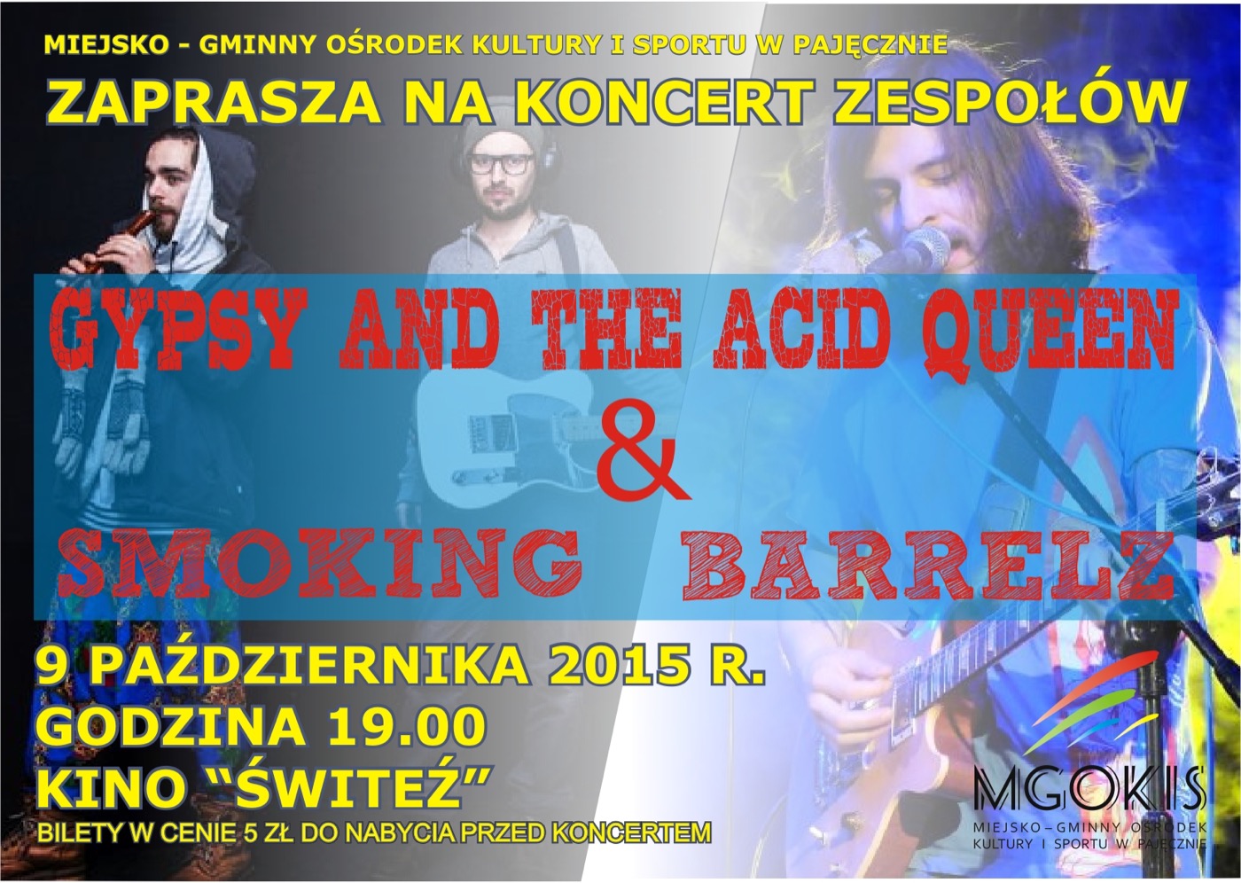 Miejsko-Gminny Ośrodek Kultury i Sportu w Pajęcznie zaprasza na rockowy wieczór w kinie Świteź. Wystąpią zespoły Smoking Barrelz, oraz Gypsy and the Acid Queen. Koncert odbędzie się 9 października, w kinie Świteź (piątek, godz 18.00).