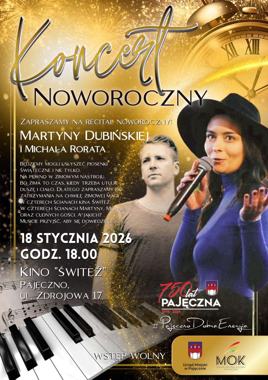 18 stycznia 2026 roku w Pajęcznie odbędzie się Koncert Noworoczny z udziałem Martyny Dubińskiej i Michała Rorata. Wydarzenie będzie jednym z elementów obchodów Roku Jubileuszowego – 750-lecia Pajęczna i jednocześnie muzycznym otwarciem nowego roku w mieście. Organizatorzy zapraszają zarówno mieszkańców, jak i gości spoza gminy do wspólnego rozpoczęcia jubileuszowego 2026 roku w artystycznej oprawie.