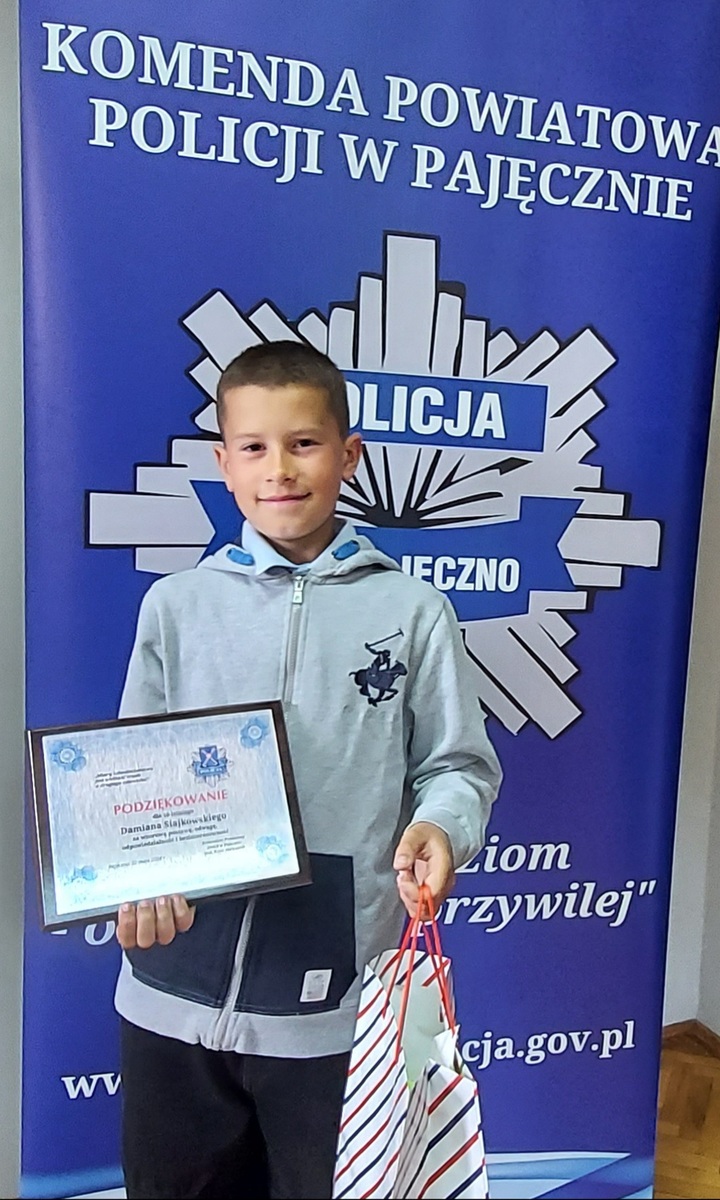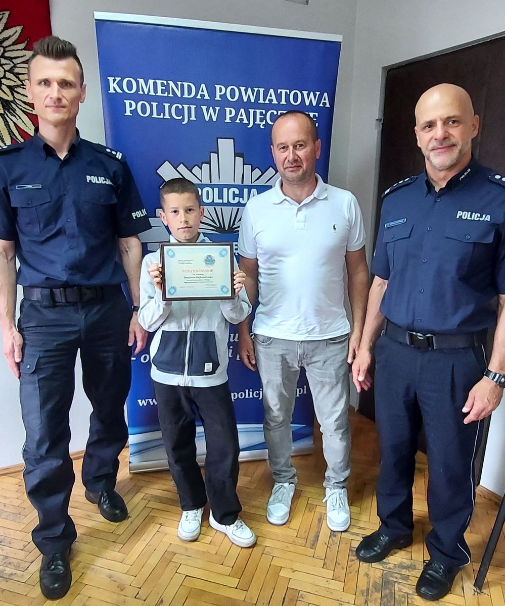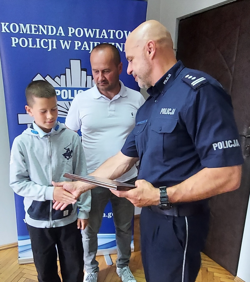Wczoraj w gabinecie Komendanta Powiatowego Policji w Pajęcznie gościł młody bohater, którego zachowanie godne jest uznania i naśladowania. Komendanci jednostki podziękowali 10-letniemu chłopcu za wzorową postawę jaką przejawił wobec leżącego mężczyzny.