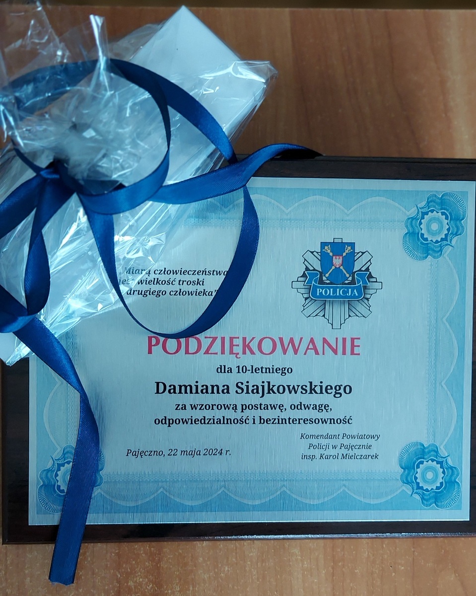 Wieczorem 17 maja, do dyżurnego policji w Pajęcznie wpłynęło zgłoszenie z Powiatowego Centrum Powiadamiania Ratunkowego. Telefon wykonał 10-letni Damian Siajkowski, który zauważył leżącego na chodniku mężczyznę. Jak się okazało, mężczyzna upadł, uderzając głową w krawężnik i przestał się poruszać. Młody Damian nie wahał się ani chwili – podbiegł do poszkodowanego, próbował nawiązać z nim kontakt, a gdy to się nie udało, natychmiast zadzwonił na numer alarmowy.