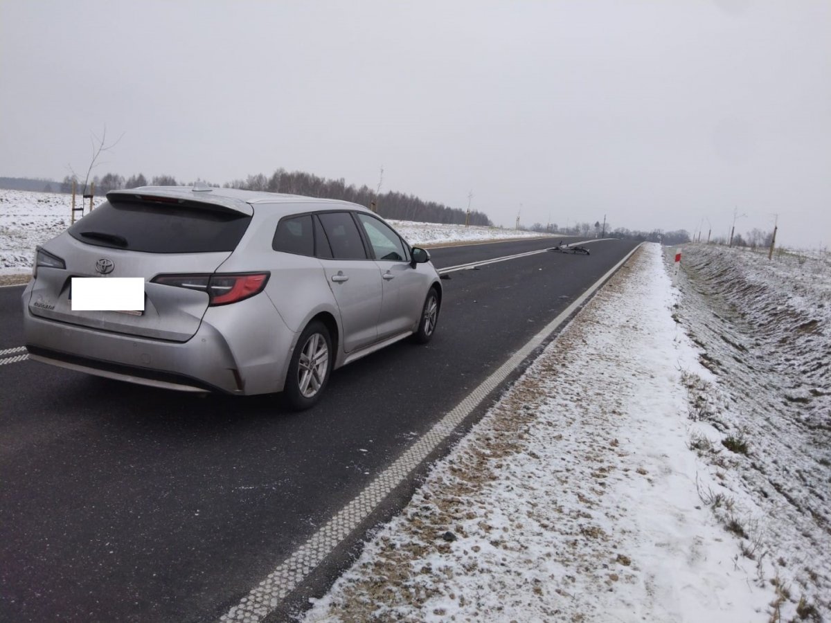 Do zdarzenia doszło w czwartek 9 grudnia o godz. 9:00 w miejscowości Skąpa (gmina Strzelce Wielkie). Na drodze wojewódzkiej nr 483 kierujący rowerem 35-letni mieszkaniec gminy Strzelce Wielkie stracił panowanie nad rowerem, zjechał na środek jezdni w następstwie czego kierujący pojazdem Toyota 40-letni mieszkanie powiatu częstochowskiego najechał na tył roweru.
