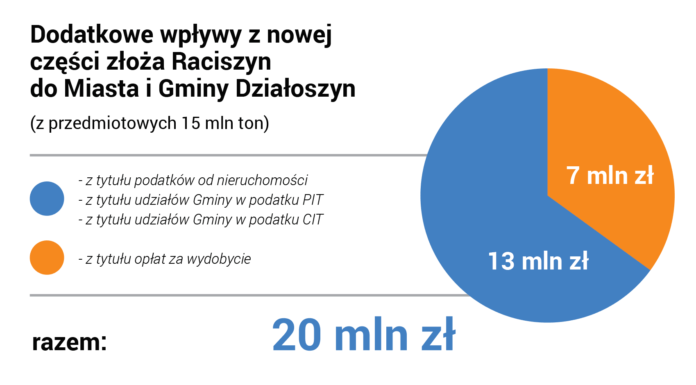 Porozumienie dotyczące zmian w studium przestrzennym gminy Działoszyn ma szansę przynieść korzyści zarówno dla mieszkańców, spółki, jak i gminy. Prace na rozszerzonym złożu w Raciszynie, które są przedmiotem dostosowania studium, sprawią, że budżet gminy zostanie zasilony dodatkowymi wpływami wynikającymi z tej działalności. Ze wstępnych wyliczeń wynika, że w przypadku ujawnienia nowej udokumentowanej części złoża Raciszyn będzie to kwota rzędu 20 mln zł. Z tego ponad 7 mln zł wpłynie do budżetu gminy z opłat za wydobycie, a kolejne prawie 13 mln zł to podatki od nieruchomości oraz udział gminy w podatkach PIT i CIT. Za takie pieniądze gmina będzie mogła zrealizować dodatkowe inwestycje komunalne z myślą o poprawie jakości życia mieszkańców. – Być może będzie to moment, w którym w gminie będzie można rozważyć powstanie takich inicjatyw, na które zwykle brakuje środków, a które mogłyby bezpośrednio podnieść standard życia mieszkańców. Wpływy te również mogłyby być np. źródłem finansowania przyszłej budowy kanalizacji czy doprowadzenia prądu – inwestycji niezbędnych na nowych terenach planowanych do zabudowy jednorodzinnej – podsumowuje Zbigniew Rybakiewicz.