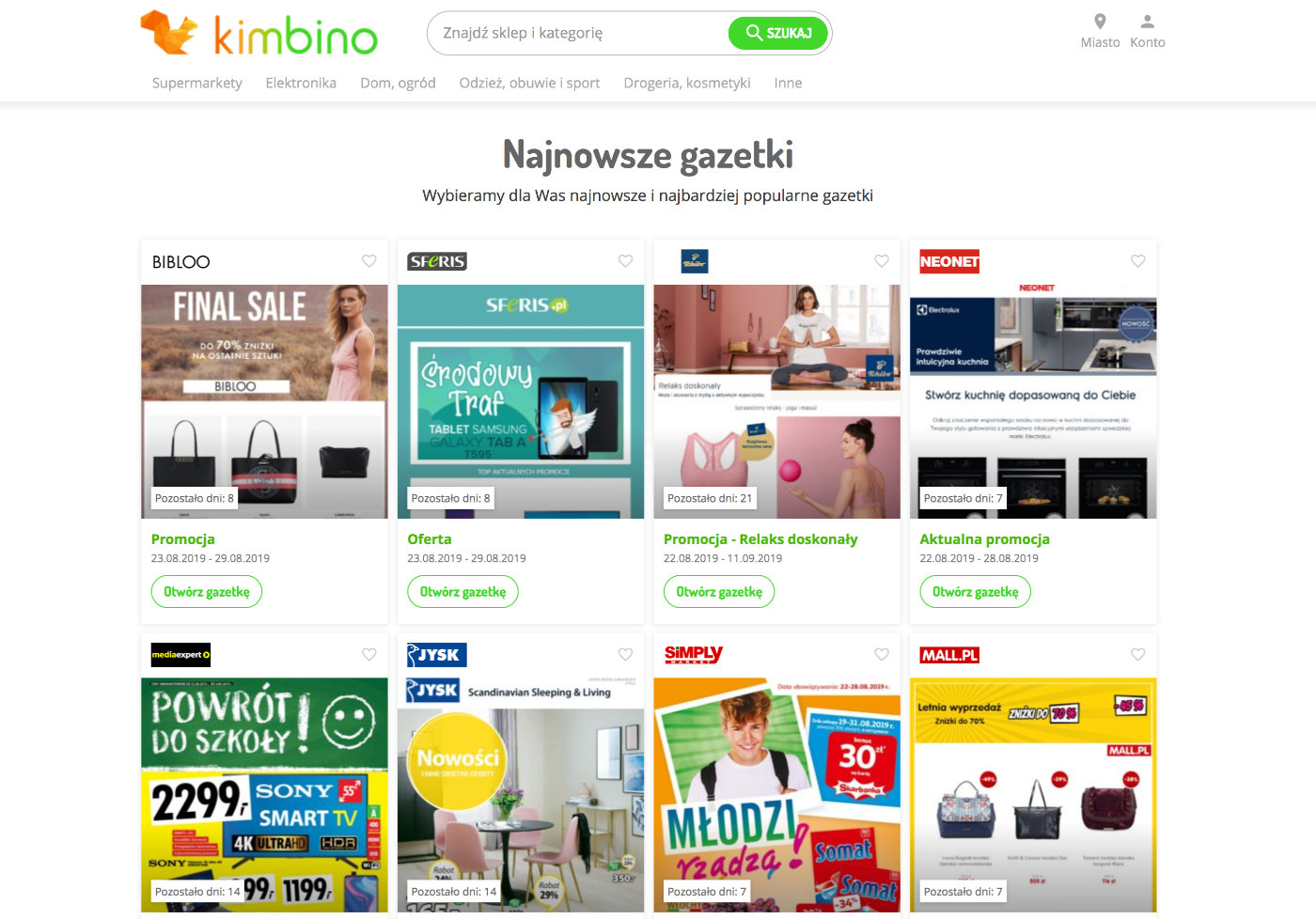 W świecie nieustających promocji warto być na bieżąco z ofertami sklepów, aby dany produkt kupić w jak najniższej cenie i oszczędzić pieniądze w domowym budżecie. Właśnie w tym celu powstał serwis kimbino.pl. Znajdziesz w nim aktualne gazetki, katalogi i ulotki reklamowe Twoich ulubionych sklepów. W kimbino.pl odnajdziesz te same gazetki, które znajdują się przy wejściu do supermarketu. Serwis agreguje promocje nie tylko z różnych marketów z całej Polski, ale znajdzie się tam również bardzo popularna szczególnie wśród pań gazetka Avon czy Oriflame. Kimbino oferuje bardzo szeroki zakres kategorii oferowanych gazetek, od sklepów z odzieżą i obuwiem po elektronikę, materiały budowlane na kosmetykach kończąc. Jeśli nazwa kimbino nie zapada Ci w pamięć, możesz odwiedzić również bliźniaczy serwis www.gazetkonosz.pl który również posiada bogatą ofertę katalogów i ulotek.